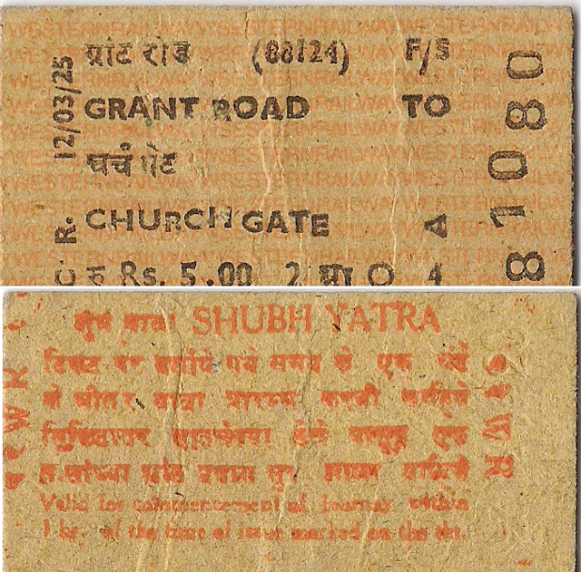 I wanted to see deeper into the suburbs so I took a local train to Grant Road. This suburban train was crowded and yet at each station more people jumped on, holding onto others who were holding onto the outside of the carriages. The overcrowding problems are reported here. The train tickets I've retained look a bit dodgy. One says use within an hour of issue but has no issue time on it. Another is dated 12/03/25. I'd left Mumbai by the 12th of march and haven't yet been in a year that ends in 25. Some recalibration is needed, methinks.