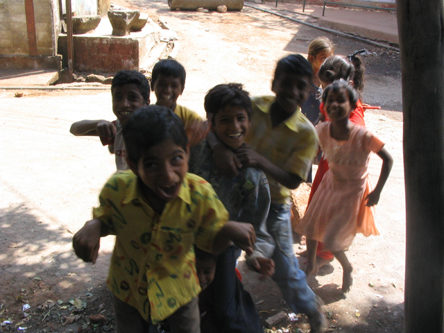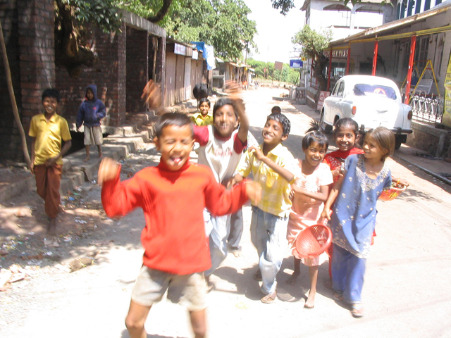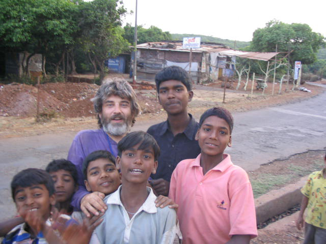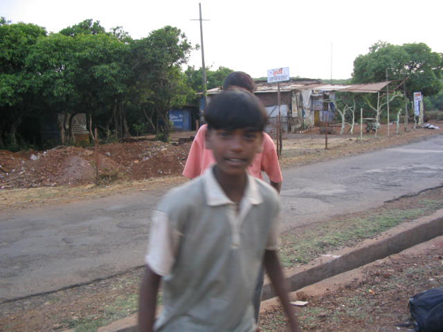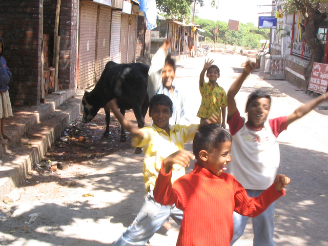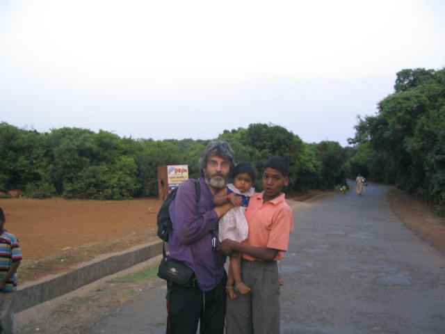 I recall buying some rather foul peanuts (still in their shells) from a stall and watching a couple of boys play cricket along the alley between the stalls. However, it was soon time to move on and so I started trudging up the road again. I encountered two little girls who were selling bunches of flowers wrapped in newspaper, ready to offer at a temple, for 2 rupees a bunch. Again, I felt unable to refuse and so bought a posy from each of them, then tied these to my rucsac. While I was doing this, some other children arrived, asking me to do jaadoo (magic). This confused me for a while but I soon understood they wanted me to take photographs of them. (I think they'd realised I have a digital camera and so they'd be able to see themselves on its screen.) I have a few shots of them spontaneously dancing and cavorting in front of me. I intend to send them hard copies sometime and so have the address of one of the older lads.