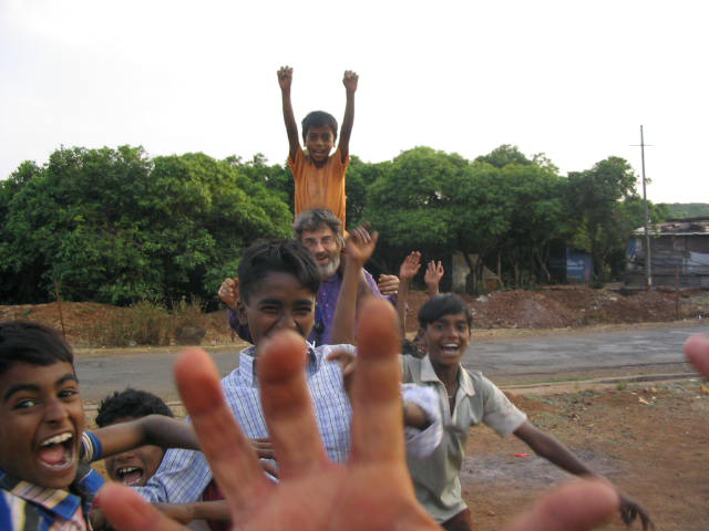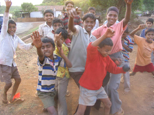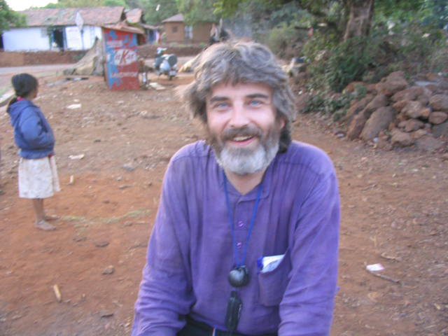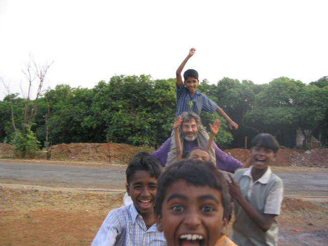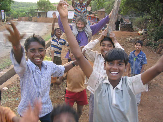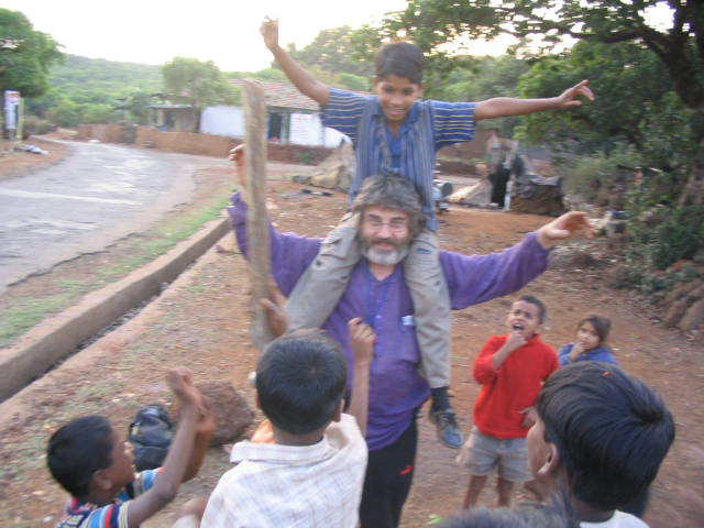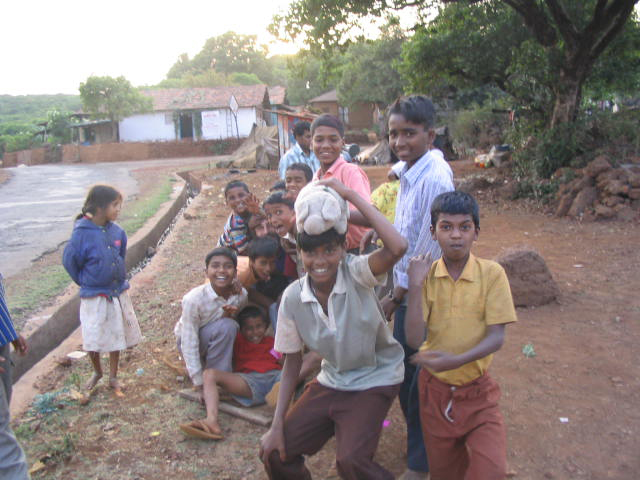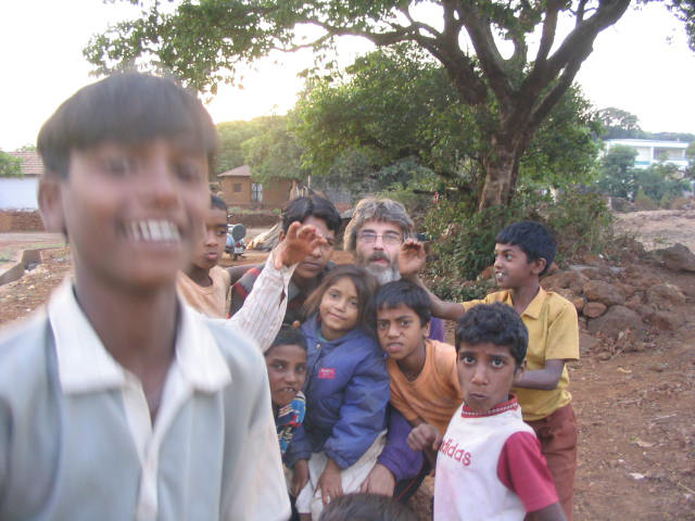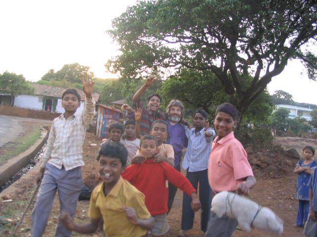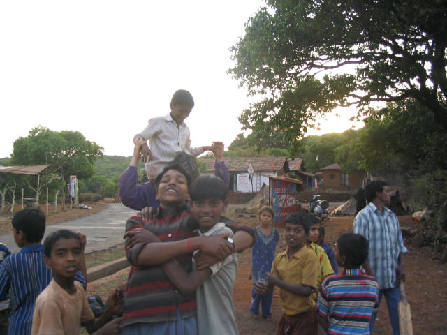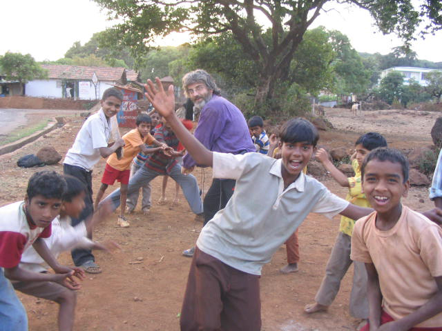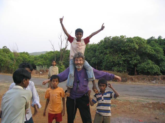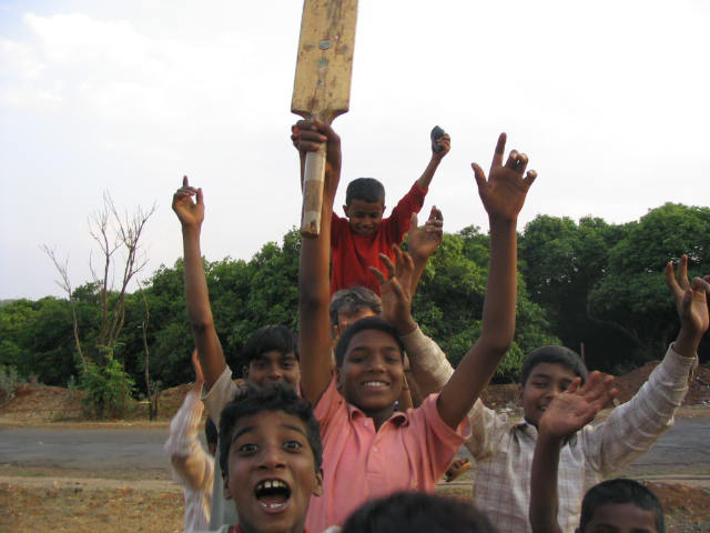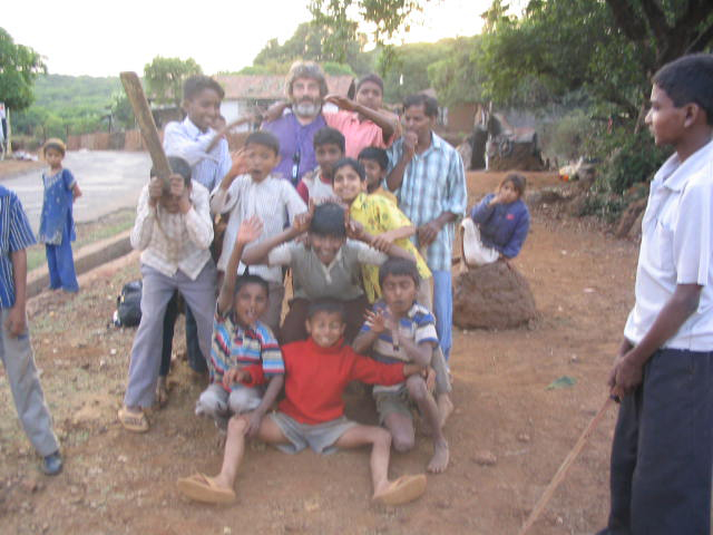 Back at Old Mahabaleshwar, the kids I'd met earlier were playing cricket with other friends. They asked me for more jaadoo and again I have some shots which amuse and give rise to other emotions I can't name. It's always lovely to watch children playing without falseness or guile and with amazing exhuberance. I noticed that one of the small children wasn't getting into the shots and so hoisted him onto my shoulders and got an older lad to take the photos. Of course, quite a few others wanted a turn at this. Also, some of them, learning I was from England, wanted me to pose with their cricket bat, and finally a shot of me holding a very young child. I don't have any qualms about any of this - it was pure enjoyment for all of us, as far as I could see and two local adults were looking on. (I'd also asked one of them if I was causing problems: he laughingly said 'no'.) Also, one of the kids gave me a sprig of small black berries (reminiscent in flavour and colour of individual blackberry pips) and showed me that he ate them, so I munched away quite happily - again, purely delicious! By now, dusk was approaching so I got a seat in a shared jeep/taxi back to Mahabaleshwar.