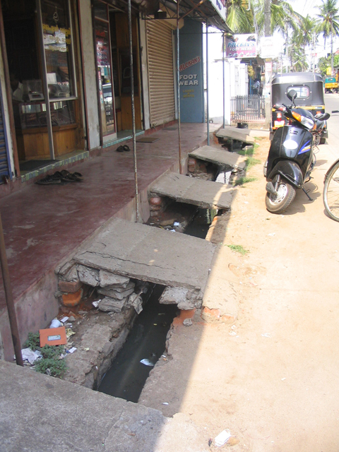 The annoying and silly thing? Indian pavements (where they exist) are slabs of concrete over the open sewers. The slabs' irregular heights and the gaps between them are usually enough to either trip you up or simply let the pong of rancid sewage mixed with Jeyes' fluid assault you. However, on Ernakulam's main street, a busy, posh shopping street which in other ways is reminiscent of Oxford Street in London or the posh bit of Princes Street in Edinburgh, the pavements are still dead rough, unlit and in one place, without warning or barrier, there's a huge gap in the pavement that reveals a shit-pit into which I'd have fallen if I hadn't stopped just in time to consult my map. I'm glad I'm moving on soon!