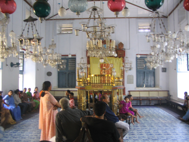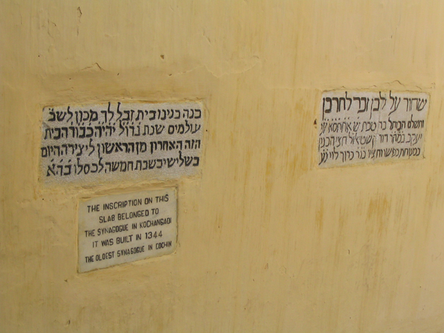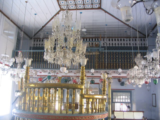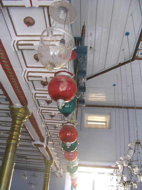 A guide was selling postcards and souvineers: I bought two postcards and a wee booklet entitled Kerala and her Jews. (The change let me pay my entrance fee.) The synagogue has beautiful lamps of Venetian (Murano?) glass and hand-made chinese floor-tiles: these are the reason for removing footwear before entering. (I had a chat with the ticket collector about the possible religious significance of this and of not being allowed to take video photography of inside the synagogue, even though still photography is permitted. She says there's no religious reason for this either. I'd be interested in comments on this from other jews.)