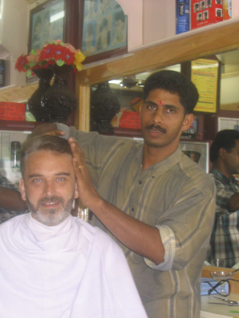 Ajeesh and I took an auto to town: the whole town's internet connection was down so that bullet point was postponed. I had a severe haircut and beard-trim and was persuaded to buy a dhoti and matching shirt. Apparently it's socially unacceptable for Brahmins to wear lunghis except when at home or doing manual work: dhotis appear to be the equivalent of a UK white-collar worker's suit. Also, apparently, I'm nearly a Brahmin because of my dietary choice, although I suspect my educational and (former) professional status may have something to do with it, as (I believe) will Ajeesh's family being Brahmin.