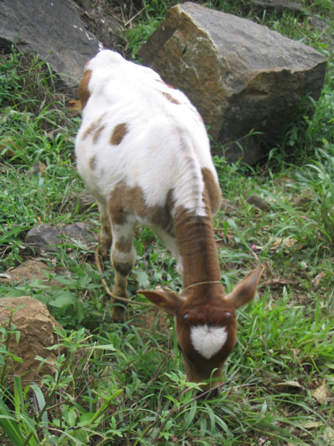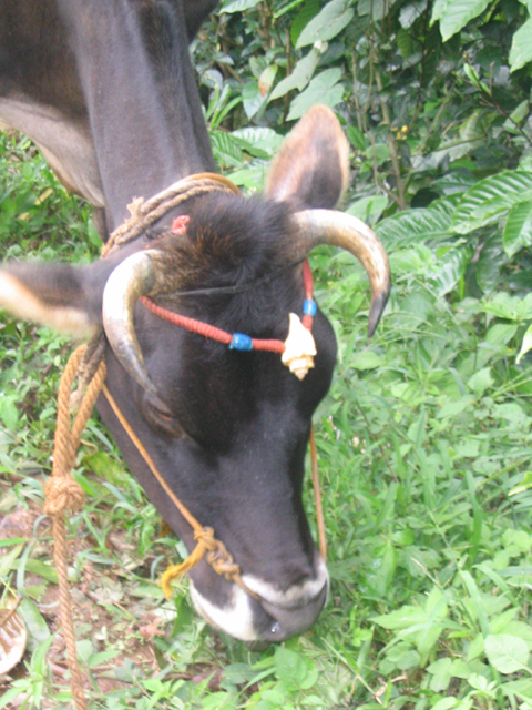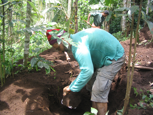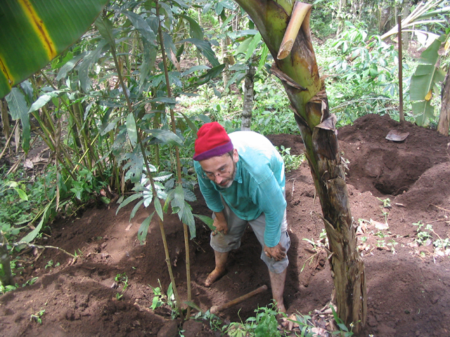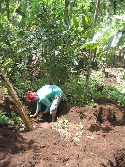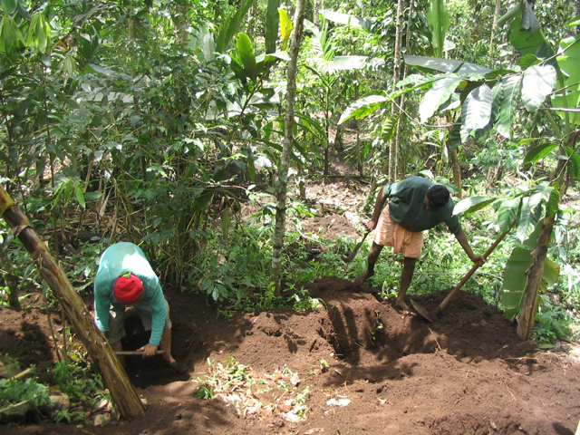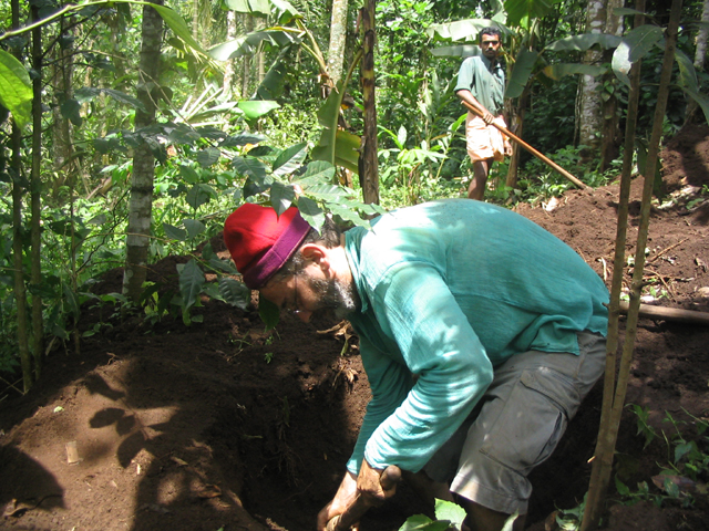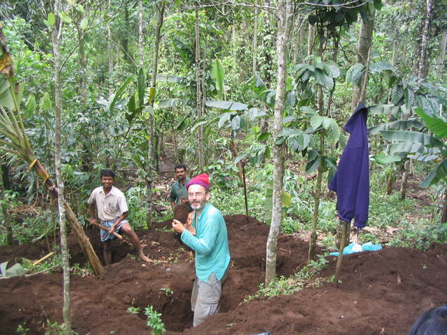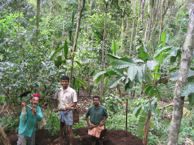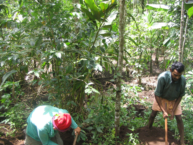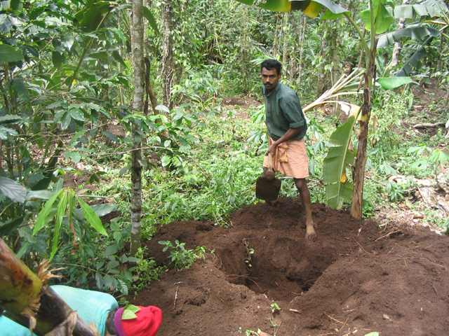 The land we were working on is at the foot of a slope, just above a tiny stream and about 25 metres down a muddy path from the main path/track. This piece of land is dotted with banana plants and other trees but neighbour-Santosh had yesterday done a lot of work, clearing the undergrowth and digging some holes in which cardomom plants would eventually be grown. These holes are about 4 feet wide by 4 feet back by up to 2 feet deep and require a lot of work: there were many more to dig.