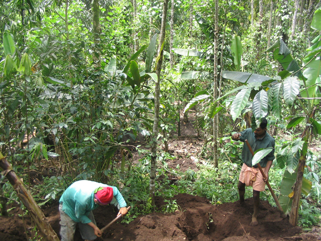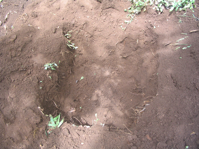 After breakfast, we went back to the field and tried a different system: Ajeesh and Santosh marked out holes while I used the koryi tambar to deepen and finish them. So I'd finish a hole in the time Ajeesh finished two but my holes looked quite good! Also I found it much easier to lift soil out of the hole with the koryi tambar - I could get it full of soil and then use my hand on the koryi tambar's heel to lift and throw the soil. I also found that I could get more leverage if I sat on the edge of the hole and chopped away at the side opposite me. This did have the unfortunate effect of making it look as though I'd had horrendous diarhoea.