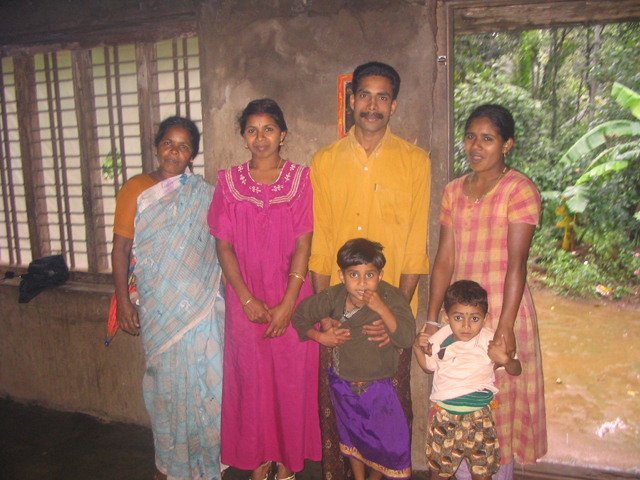 Near the house I met Gopalakrishna, Ajitha, Santosh-husband and Kanan. Gopalakrishna was accompanying the others part of the way to their house. The house itself was dark apart from an oil-lamp and a torch: the electricity supply had failed again, presumably upsetting the neighbours who'd arrived to watch TV. (Ajeesh's family cook on a gas double burner and heat water on a wood fire in a lean-to at the back of the house. This is also often where their goat is tethered.)