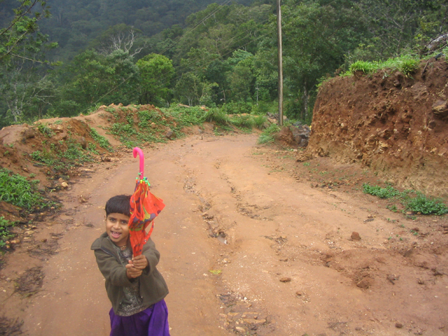 Eventually, Jaya indicated that I, Kanan and Sandra should go out to buy a coconut. We got as far as the highest, exposed-to-the-elements part of the path before the weather, Kanan's fear of the slope and his overlarge umbrella conspired to upset him to immobility. I though the best thing to do would be to take him back to the house, so with some difficulty I persuaded Sandra to accompany us - I didn't want to be responsible for her wandering off without her family knowing where she was.