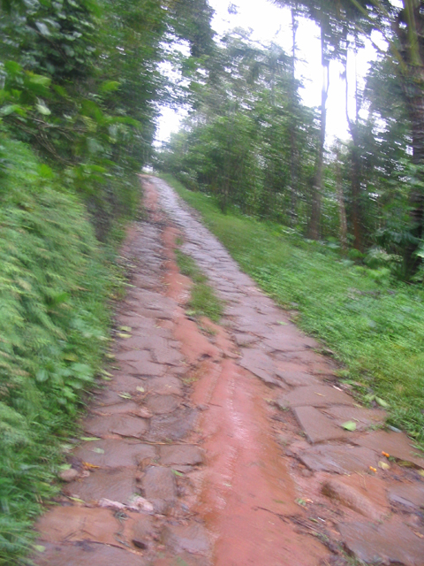 By now it was around 6pm and getting near dusk. I really didn't want to be caught on a mountain after dark, especially because my lunghi and jacket were wet through, so headed down the hill. I seem to recall singing non-rude but silly variants on the tune to 'Oh Sir Jasper' as I went. The only time I slipped on the muddy path was just after I'd washed my sandals and feet in a small stream. My feet and sandals, my knees and backside got covered in red mud, much to my amusement and the concern of two locals who helped me up and advised me that the reddest parts of the path were the least likely to be slippery.