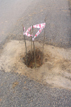 I was intrigued by the way the main road was being resurfaced. Gaps had been left in the new surface where phone-line poles remained. Over a month later, the poles were pulled down by teams of labourers, leaving these scars. They would be filled in a week later.