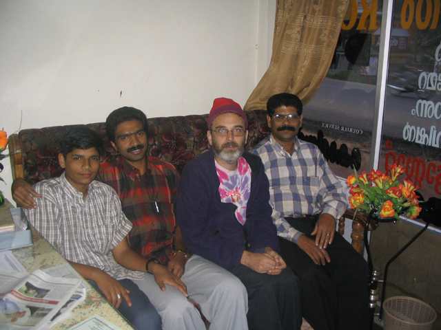 Email had brought some good news concerning one of Ajeesh's projects. I showed it to him and asked if the reply I'd drafted was OK. He liked it, so we quickly visited the architect/DTP cybercafe for me to send it on. It was also time to say goodbye to Mr Ozhathil and his sons and colleagues. One of them, Shaji, was away - his brother had just been killed in a road accident. Mr Ozhathil showed me that day's copy of Malayalam Manorama ('Keralan-language world') newspaper. There was a report on yesterday's event. I can't read a word of it except that I recognise my name in there: I've been in a foreign newspaper, for doing something good and I'm very pleased about that.
