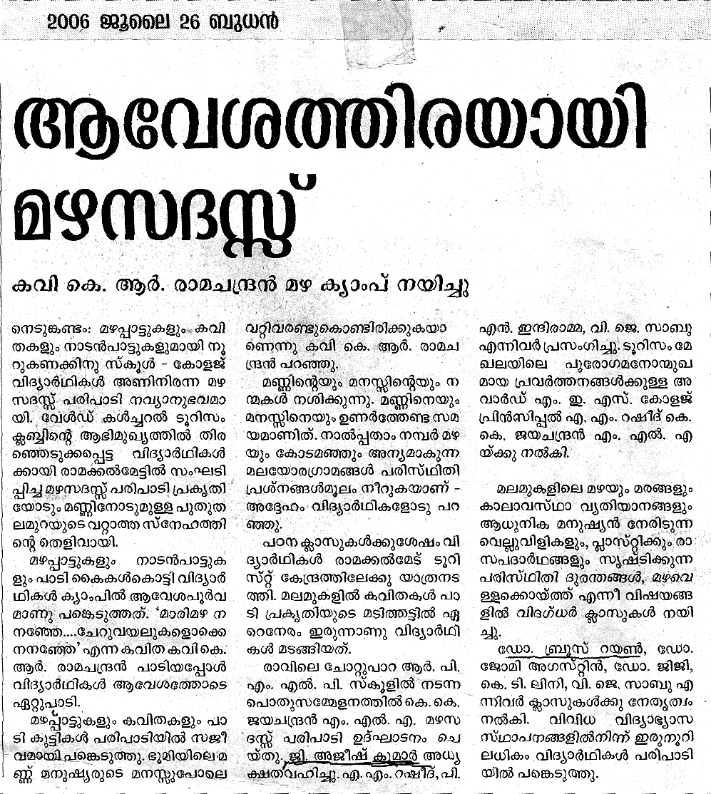 Yesterday was Malasadass ('monsoon meeting'), the schools event at which I was to talk. It was opened by an MLA. Other speakers included the Deputy Director of Periyar Tiger Reserve, a local director of education and a fantastic poet/singer. Malayalam folk songs can be entrancing even when I don't understand a word of them!