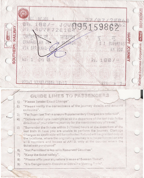 I think I slept for a lot of the rest of the journey. I don't remember the aunts getting out. At Ernakulam I found that my train's times had been altered: it would leave at 10·45, not 12·45. This meant I had 15 minutes to visit an ATM, get a ticket and get on the train - not even enough time to have a last chaya with Ajeesh. In fact it was after 10·45 by the time I got back from the ATM: thank goodness for late-running trains. I cried as my train pulled out of the station. I know I'll be back but...