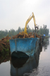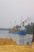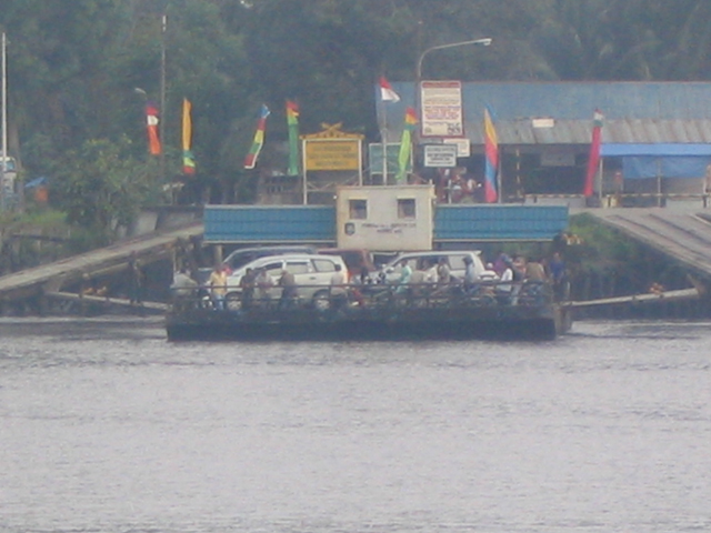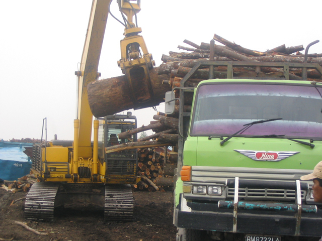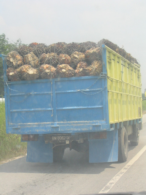 We drove through miles and miles of native forest and kelapa sawit plantation, to a canal bridgehead: here logs that had been cleared from the site we'd visited earlier were offloaded from barges that travelled along a canal to the bridgehead. A massive caterpillar-tracked grabber lifted the logs and plonked them onto lorries which shook as each 'mouthful' was added. Then the grabber picked up a huge log and knocked this against the logs to balance the load and push in any logs that were sticking out.