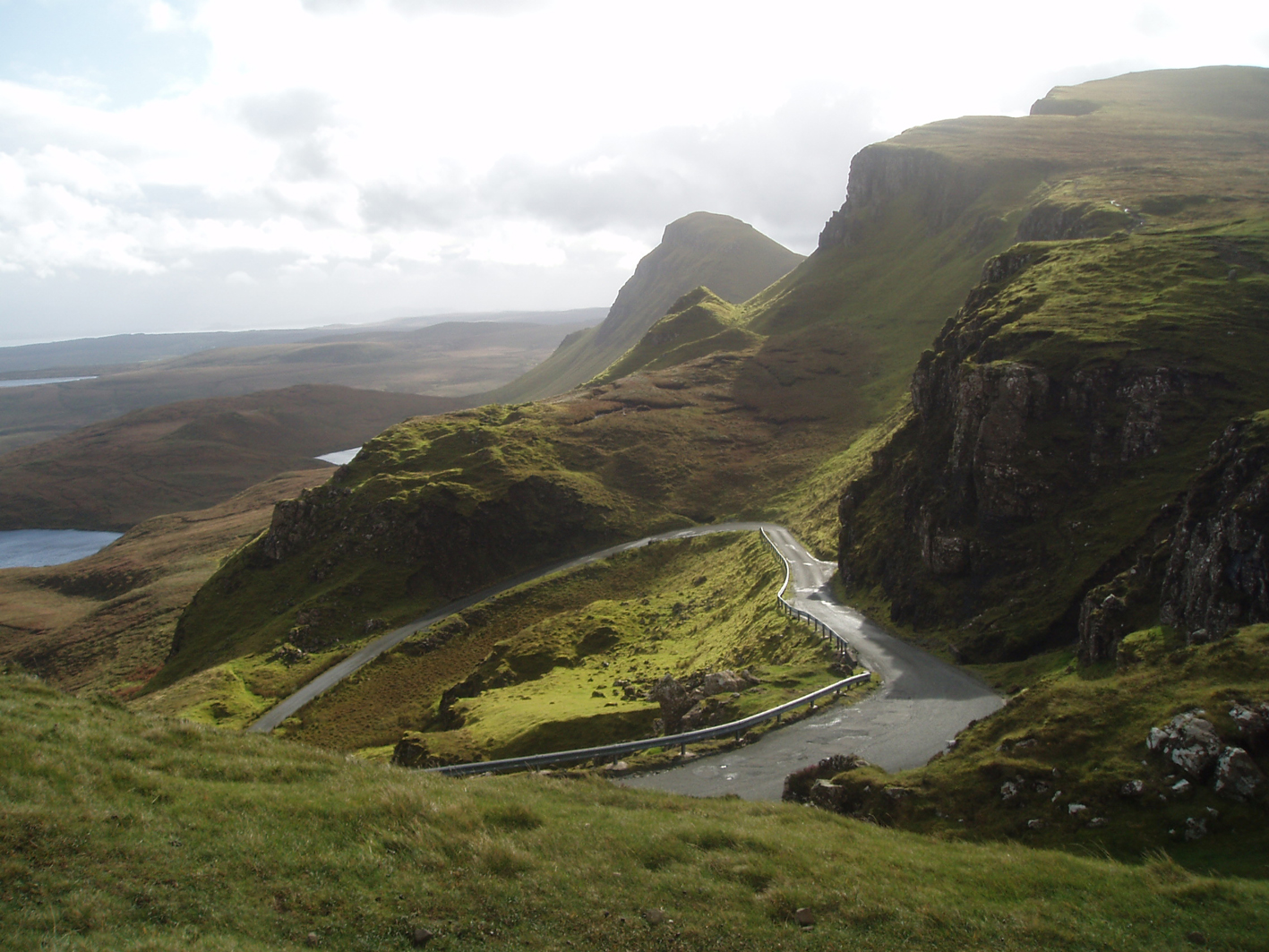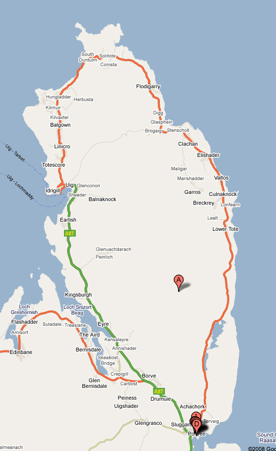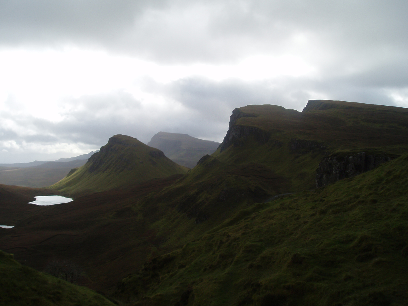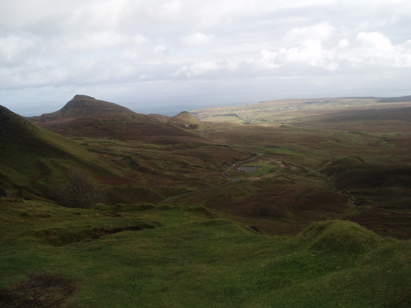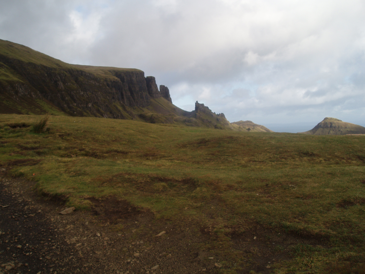On Monday, while we were driving around Trotternish, we saw a wee road that leads from north-east of Uig east to Staffin. On the map were marked some mad crags, including Quiraing. So we wanted to have a look. More driving through Skye's fairly crazy roads took us to the lower car-park by a cemetary. However, this was far below the crags so Elly drove us back up the craziest road Glob has ever been on to a car-park above the crags. The wind was mild for that region and the rain seemed to be holding off so we started trudging towards Quiraing. However, our path was blocked by a stream-gorge so we didn't quite make it. Some day!