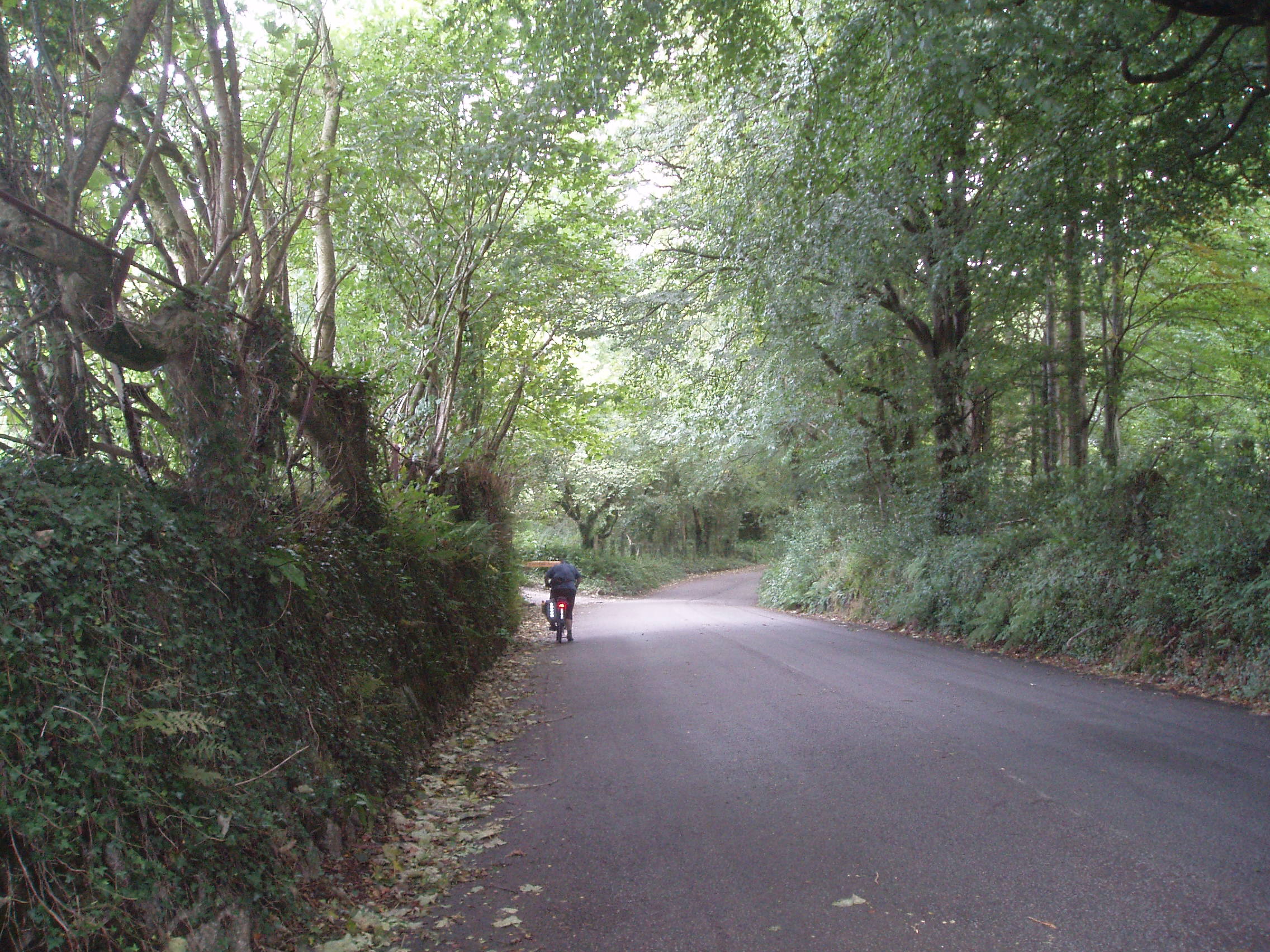 Charleston into St Austell, then east to Tregrehan Mills, then north to Eden Project. Our first map-reading mistake (as all others until Sunday caused by not having proper OS maps) took us further into St Austell than necessary, up the first steep hill of the day. This was where I discovered the joy of 21-speed low-geared touring bikes.