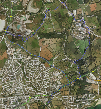 The scenery around old clay pits was spectacular but we had little time to enjoy it. The weather and night were closing in and by the time we'd reached a major road which we were due to cross before taking other tracks back to St Austell, we were too wet to appreciate the purity of off-roadness. Fortunately, the A391 which screams down into St Austell from the northwest, has a cycle-path along its west side.