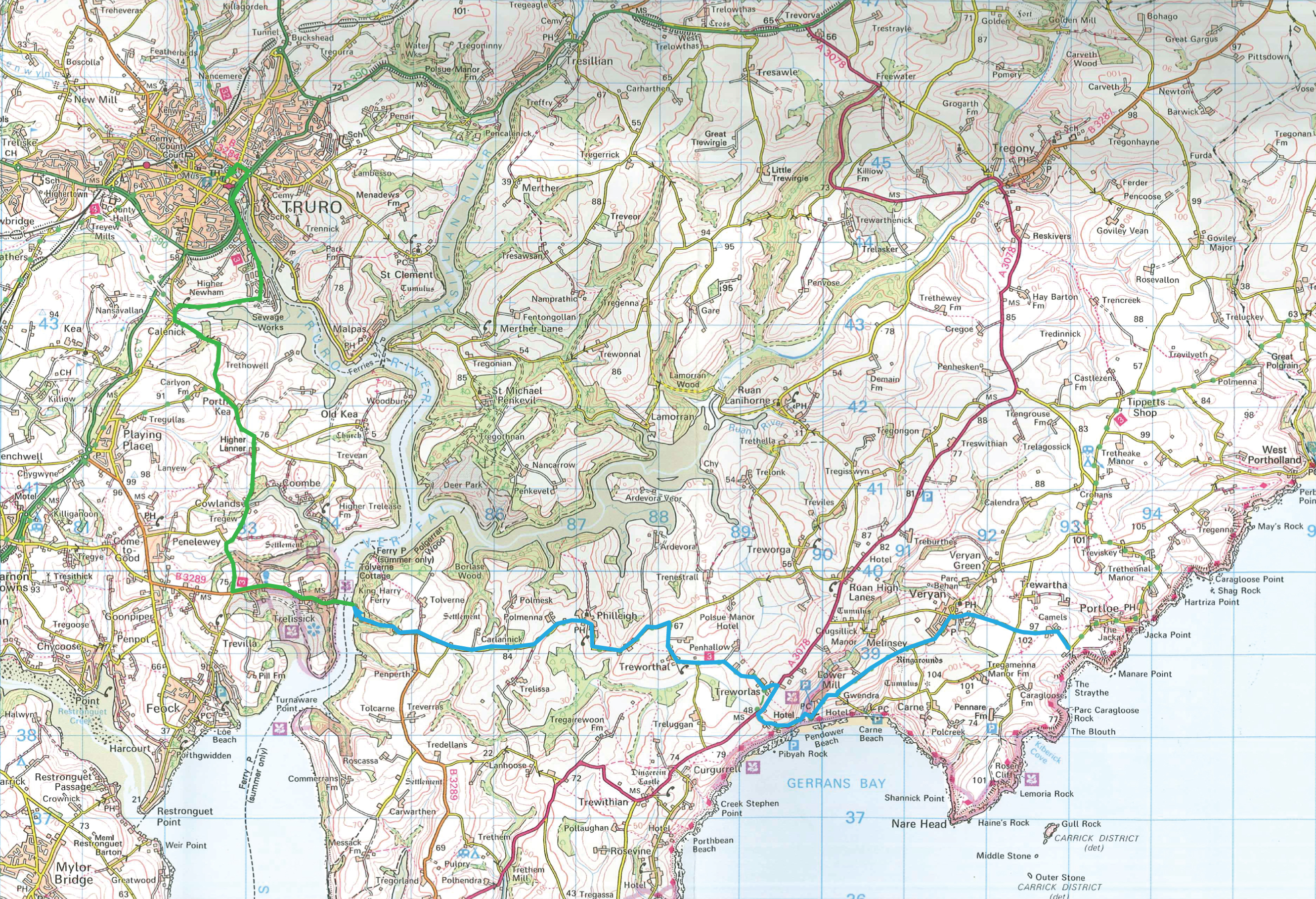 - Following Route 3 west from Portloe via Veryan, Pendower Beach, Treworlas, Treworthal, Philleigh and downhill to the river Fal