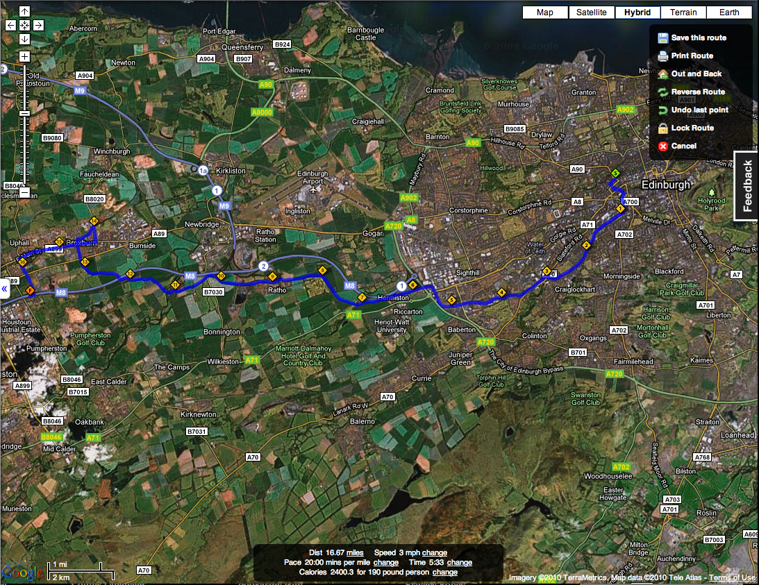 We decided to follow up yesterday's 16 miles with an hour or so along the Union Canal towpath. To my delight, there is fresh tarmac until about half a mile beyond the bypass. It took us under an hour to reach the bypass, so we pushed on to Ratho Station. We stopped that the Bridge Inn for a drink an to plan our next move. We realised that we were at least 6 miles from home and that it wasn't that much further to the nearest station (Uphall) so it seemed desirable to explore further rather than simply head home. We reached Uphall station just in time for the 18:07 train. It took the train 14 minutes to take us back what had taken us 3 hours. My backside may never forgive the lack of tarmac from after the bypass to Broxburn!